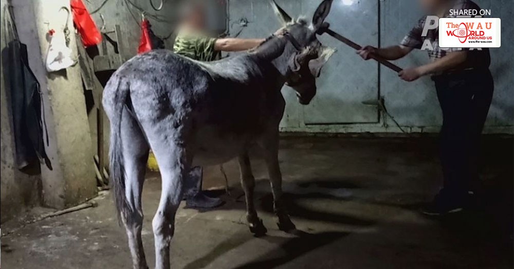 The undercover video, obtained by People for the Ethical Treatment of Animals (PETA), shows donkeys as young as 5 months being killed so that their skins can be used to produce a brown gelatin, which is an essential ingredient in Chinese ejiao products.