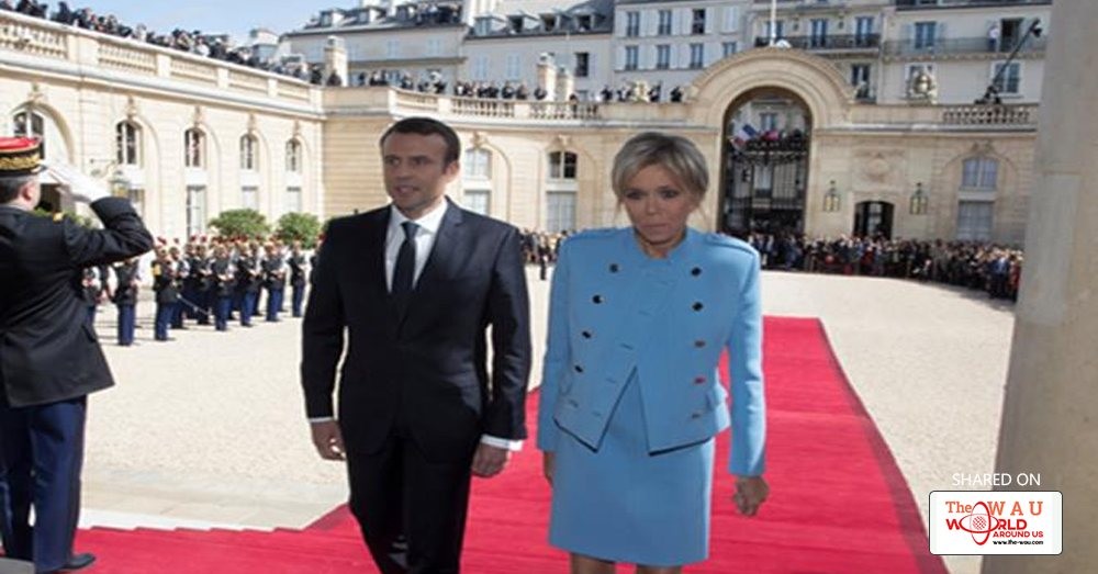 His wife Brigitte, a 64-year-old who was his high school drama teacher, attended the ceremony and a later meeting at the Paris town hall wearing a light blue Louis Vuitton outfit.