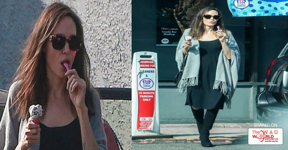 It’s always comforting when you see your favourite celebs chowing down on those unhealthy treats you love too. And it seems even Angelina is partial to a tasty ice-cream cone when the sun is out. The 42-year-old, appearing to be kid-free for the afternoon, was seen heading inside Baskin-Robbins in Los Angeles for a scoop of her favourite flavour and a cone.