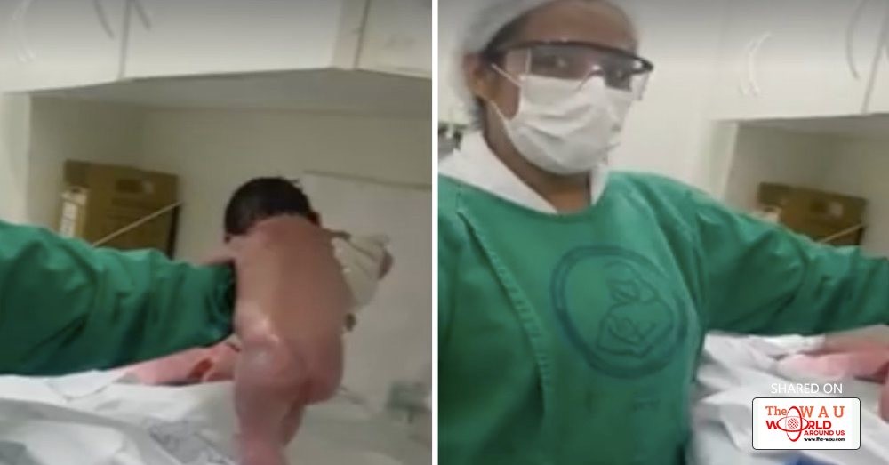 The Daily Mail reported that the scene, from Brazil, started when the midwife tried to wash the baby. "Merciful father. I was trying to wash her here and she keeps getting up to walk," she said.