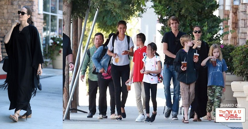Appearing to go make up free for the outing, Angelina hid her striking features behind a pair of sunglasses and swept her brunette tresses up into a low ponytail.