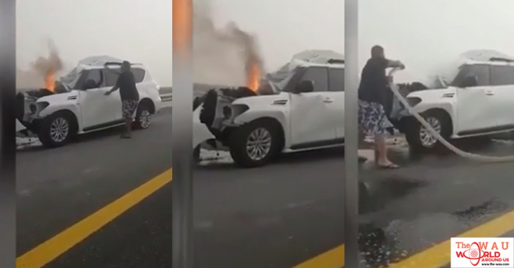 In a video of the rescue posted by the Dubai Police on their Instagram account on Saturday, the officer can be seen approaching the burning vehicle cautiously. He can then be seen trying to open the door, but it’s locked. He climbs on the foot railing of the vehicle to force the door open, but is unable to do so.