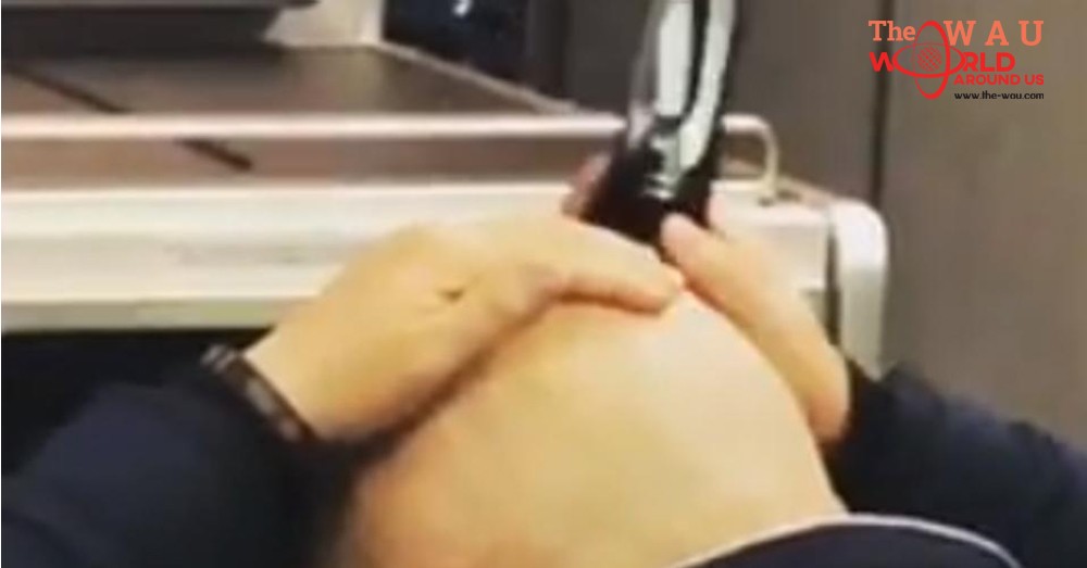 The unknown man was in the business class section of a United Airlines flight when he began removing his hair with an electric razor.